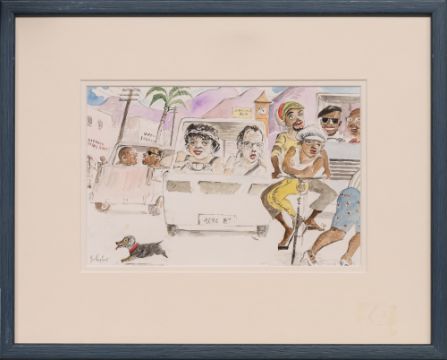 Handwritten artist's label verso Note: John Johnstone is one of Scotland’s leading artists working in a figurative style. He was born in Forfar in 1941. He studied at Duncan of Jordanstone College of Art from 1959 to 1964 under David McClure and Alberto Morrocco. He later returned to teach life drawing classes to a new generation of artists who have gone on to forge their own successful careers. He is a regular exhibitor at the Royal Scottish Academy and the Scottish Society of Artists and is a professional member of the Scottish Society of Artists and Scottish Visual Arts. “My paintings seem to be expressing something, either serious or amusing about life. They depict people acting out minor dramas. Gesture, composition, characterisation and setting are important. There is an element of gravity in them, but the humorous side probably eclipses that aspect.” Art historian Edward Lucie-Smith wrote: “John Johnstone is a unique artist – in the special sense that he has no problem in being original. His only problem is keeping that originality within bounds.” John has works in public and private collections at home and aboard including HRH the Duke of Edinburgh, The Carnegie Trust Art Collection, Angus Council Collection, Dundee City Collection, The McManus Galleries Collection and Fife Council Museums West Collection. In The Scottish Contemporary Art Auction of 21st August 2022, lot 205, "Jiving at the Palais" by John Johnstone sold for £1200 (hammer).
