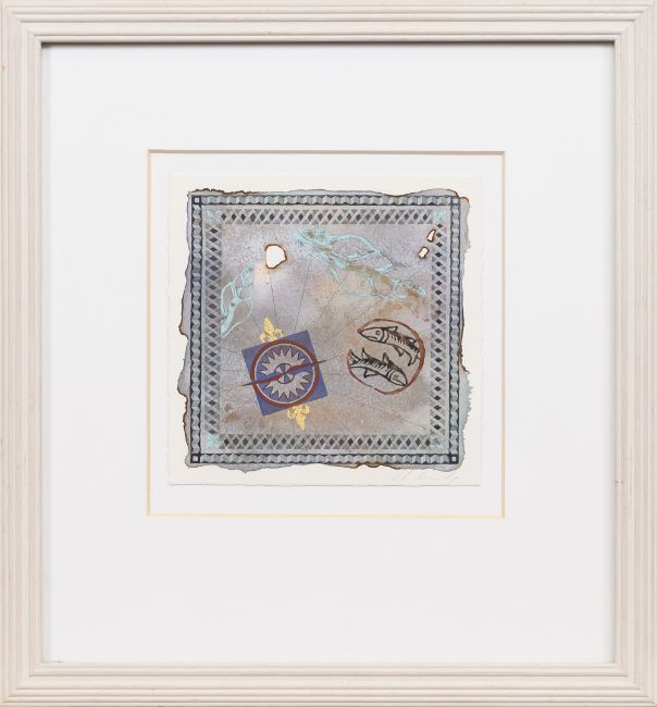 watercolour on paper, signed, titled labels verso mounted, framed and under glass image size 19cm x 19cm, overall size 47cm x 44cm Exhibition label verso: Painters in Watercolours, April 1992, Kingfisher Gallery. Note: Victoria Cassidy studied at Glasgow School of Art from 1983-87, a time when figurative art in Scotland was enjoying a resurgence. She combines her love of Islamic pattern making and Japanese prints with the use of figurative elements and text to produce her delicate, multi-layered, mixed media paintings. She continues to work as a painter, exhibiting her work both at home in Scotland and in London and she also took over ownership of the Mansfield Park Gallery in May 2006.