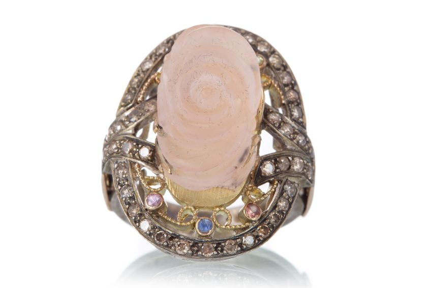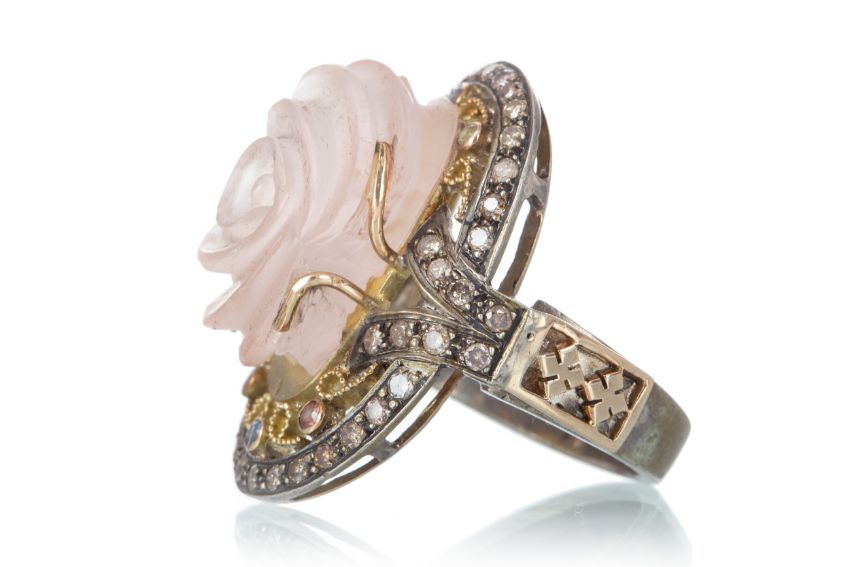 set with a central carved rose quartz in the form of a rose, to a diamond set mount, silver gilt, size U
