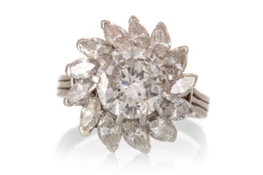 set with a central round brilliant cut diamond of approximately 2.45 carats within a halo of marquise diamonds, unmarked, approximate size M 1/2 Suffers a large chip that has caused fractures to the central stone. Heavily included to the naked eye. Marquise stones cloudy. Some claws bent out of shape/broken. Shank is misshapen.