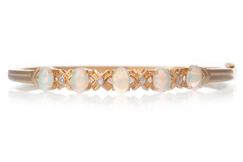 set with cabochon opals interspaced by small diamonds, in eighteen carat gold 10.7g