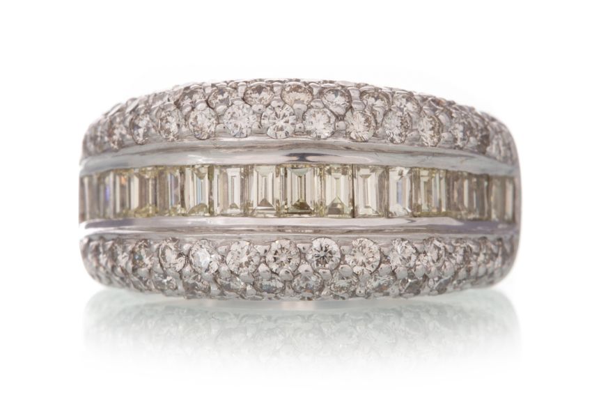 set with round and baguette cut diamonds totalling approximately 1.34 carats, in eighteen carat white gold, size J 1/2 8.8g