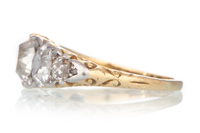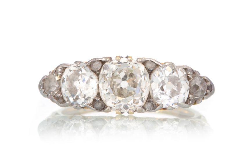 set with Old Mine cut diamonds totalling very approximately 2.50 carats, interspaced by small diamond accent stones, unmarked, size L 5.1g Central stone - 6.9x6.6x4.6mm Chips to the diamonds. One with a large chip (mid size stone).  Minor inclusions visible under magnification.  Diamonds of a good white colour - very lively.