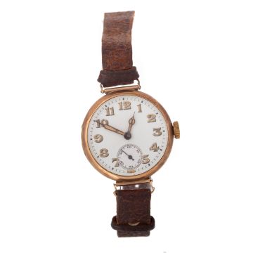 WWI, the round dial with Arabic hour markers, outer railroad seconds track, 30mm case, on a brown leather strap, lacking box and papers MOVEMENT: Ticking at present. WEAR: Generally worn. DIAL: Fair condition. CRYSTAL/ACRYLIC: Scratches and scuffs visible. HANDS & MARKERS: General loss of lume from the markers. CROWN: Intact. BRACELET/STRAP: Heavily worn. Buckle loose. Longines swiss movement.