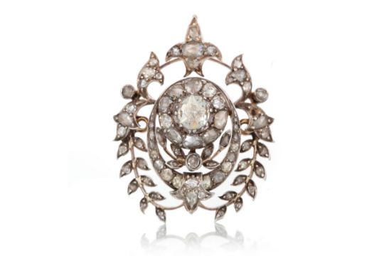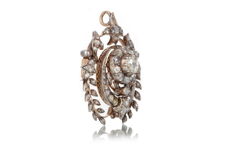 the central foil backed rose cut diamond of approximately 0.50 carats, to an openwork mount with further set with rose cut diamonds totalling an additional approximate 1.50 carats, on unmarked rose gold 40mm high Yellow tint to some stones Others dark grey  Inclusions visible to the naked yellow in most stones Weight - 12.5g