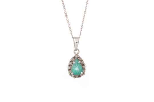 the pear shaped emerald within a halo of small diamonds, in nine carat white gold