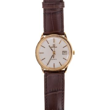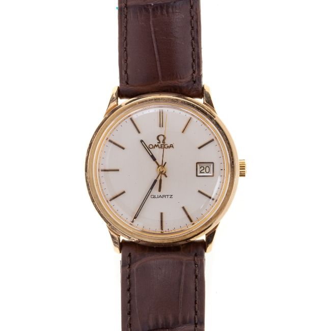 the round dial with baton hour markers, 34mm case, on a brown leather strap, lacking box, with papers Please note that this watch has not been opened. MOVEMENT: Not ticking at present. WEAR: Generally worn. DIAL: Fair condition. CRYSTAL/ACRYLIC: Fair condition. HANDS & MARKERS: Intact. CROWN: Intact. BRACELET/STRAP: Generally worn.