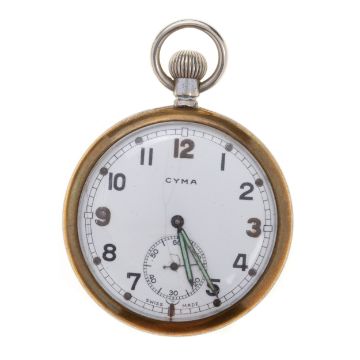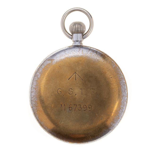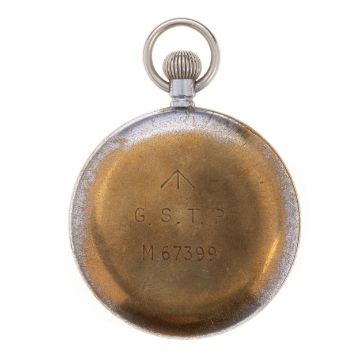 the round dial with Arabic hour markers, outer railroad seconds track in black, subsidiary dial at 6, 51mm case with broad arrow, G.S.T.P and M67399 to the reverse Not in working order. Multiple cracks to the dial. Lume discoloured.
