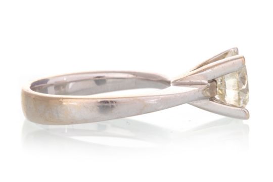 the round brilliant cut diamond of approximately 2.50 carats, unmarked, size N 7.4g Well worn condition. Shank scratched, nicked and requires replating. Moderate yellow tint to the stone. Minor inclusions visible under magnification. All claws intact. Stone secure.