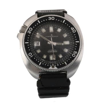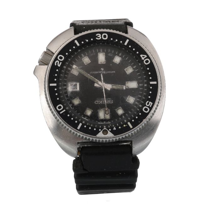 the round dial with lume filled hour markers, 44mm case, on a black strap, lacking box and papers Purchased as new by the current vendor circa. 1978. Ticking at present. Well worn. Scrapes to the acrylic. Some loss and discolouration to the lume. Strap in well worn condition.