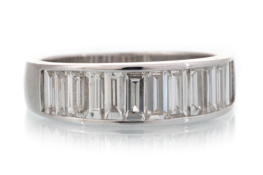 set with baguette cut diamonds totalling very approximately 1.20 carats, in eighteen carat white gold, size P 1/2 6.6g