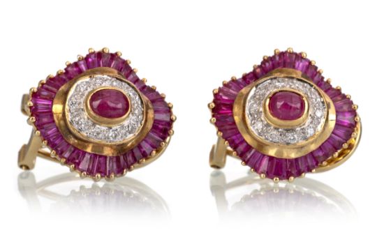 ballerina style, set with cabochon and tapered baguette cut rubies and round brilliant cut diamonds, in eighteen carat gold