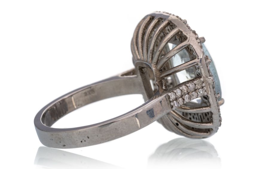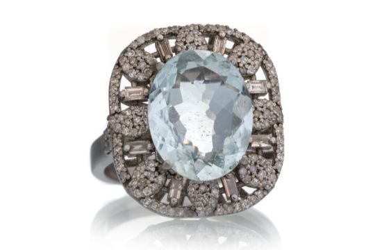 set with an aquamarine of approximately 4.80 carats, to a diamond mount totalling approximately 0.65 carats, in silver, size O