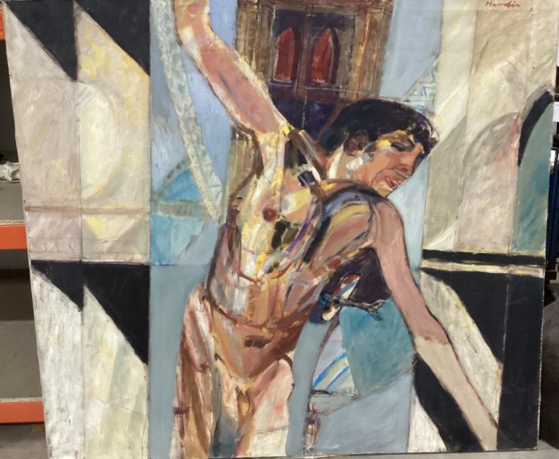 oil on canvas, signed, titled verso unframed overall size 136cm x 152cm Note: James Hardie was an artist, pilot, writer and educator. He studied at GSA, 1955-59, received The Keith Award 1958, The Chalmers Bursary 1959, The Torrance Award in 1968 among others. Hardie returned as a painting lecturer 1980-1995. His first major art project, inspired by the rock formations at Fife Ness was the subject of a film; The Painters Landscape” commissioned by The Royal College of Art in 1967. Prime time 6pm BBC news broadcast his inaugural flight on an old Messerschmidt plane that he rebuilt by hand over many years, with help from British and French engineers. Hardie’s art explores the direct physical encounter of nature by exploring ways of traveling though it - the airplane, motorbike, boat. For Hardie, the wide open spaces in the Scottish landscape where sea meets land were a constant source of inspiration. He felt Scotland gave him everything and more than he needed. He was a fierce advocate of truth and speaking directly from first hand experience. When teaching at Aberdeen College of Education, he invented, together with his boss and fellow pilot Bill Burns, the concept of “Area Investigation“. Hardie would fly his students to remote islands all over Scotland and encourage them to engage with the people, landscape and culture in order to broaden their experience of life and art practice in new and surprising ways. Public collections include Aberdeen Art Gallery, University of Stirling, Scottish Arts Council, Contemporary Art Society, Kendal Art Gallery, Hospitalfield, South Lanarkshire Council, Low Parks Museum.