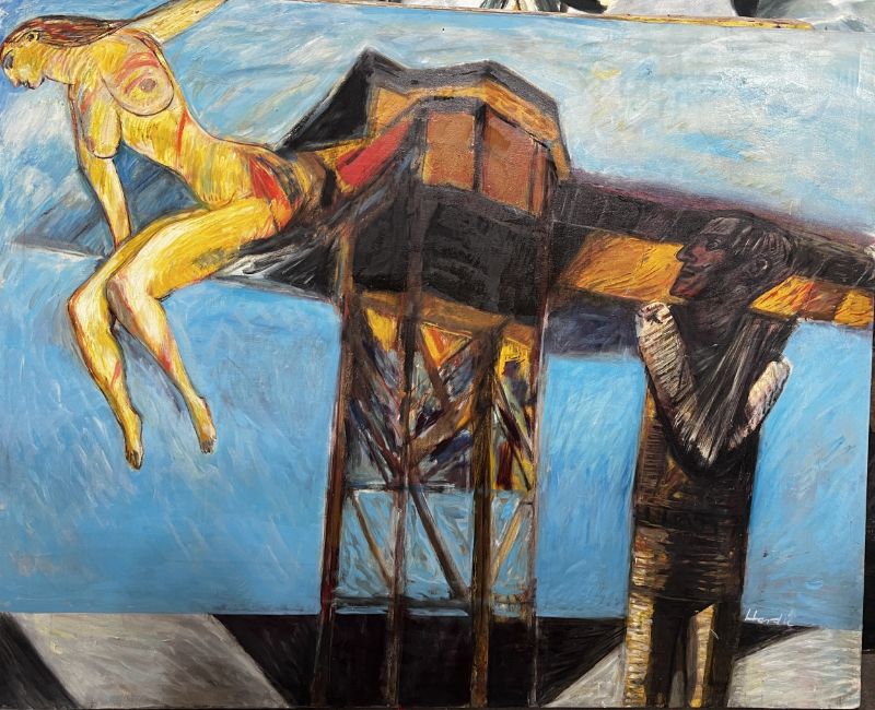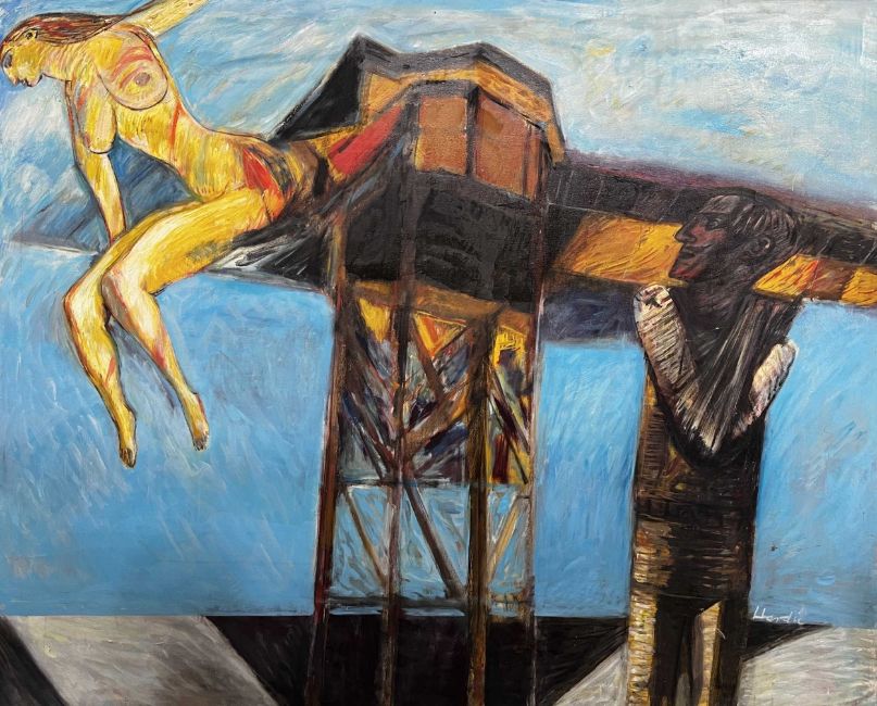 oil on canvas, signed unframed overall size 122cm x 153cm Note: James Hardie was an artist, pilot, writer and educator. He studied at GSA, 1955-59, received The Keith Award 1958, The Chalmers Bursary 1959, The Torrance Award in 1968 among others. Hardie returned as a painting lecturer 1980-1995. His first major art project, inspired by the rock formations at Fife Ness was the subject of a film; The Painters Landscape” commissioned by The Royal College of Art in 1967. Prime time 6pm BBC news broadcast his inaugural flight on an old Messerschmidt plane that he rebuilt by hand over many years, with help from British and French engineers. Hardie’s art explores the direct physical encounter of nature by exploring ways of traveling though it - the airplane, motorbike, boat. For Hardie, the wide open spaces in the Scottish landscape where sea meets land were a constant source of inspiration. He felt Scotland gave him everything and more than he needed. He was a fierce advocate of truth and speaking directly from first hand experience. When teaching at Aberdeen College of Education, he invented, together with his boss and fellow pilot Bill Burns, the concept of “Area Investigation“. Hardie would fly his students to remote islands all over Scotland and encourage them to engage with the people, landscape and culture in order to broaden their experience of life and art practice in new and surprising ways. Public collections include Aberdeen Art Gallery, University of Stirling, Scottish Arts Council, Contemporary Art Society, Kendal Art Gallery, Hospitalfield, South Lanarkshire Council, Low Parks Museum.