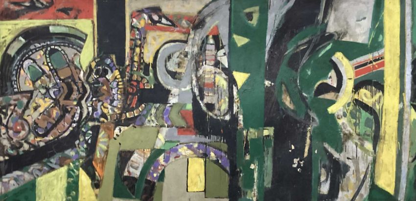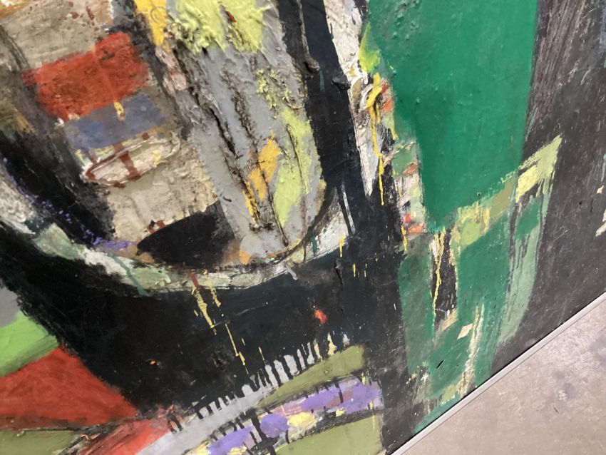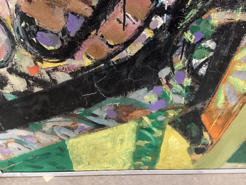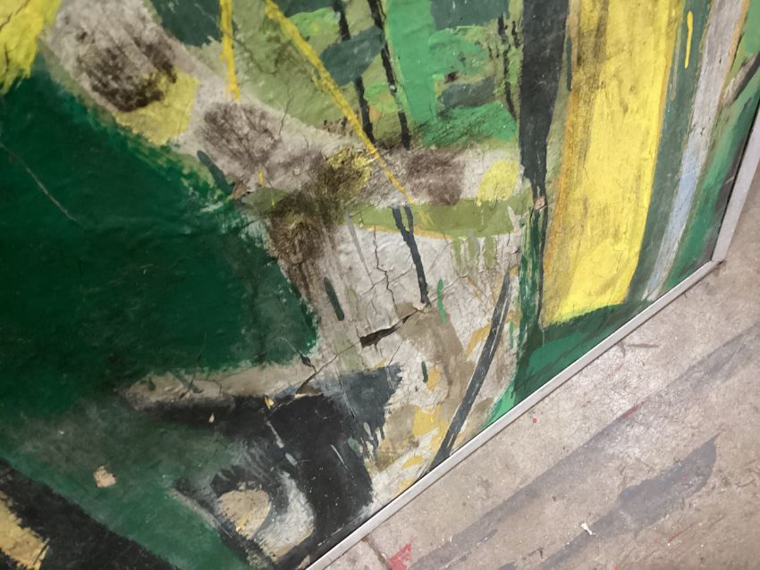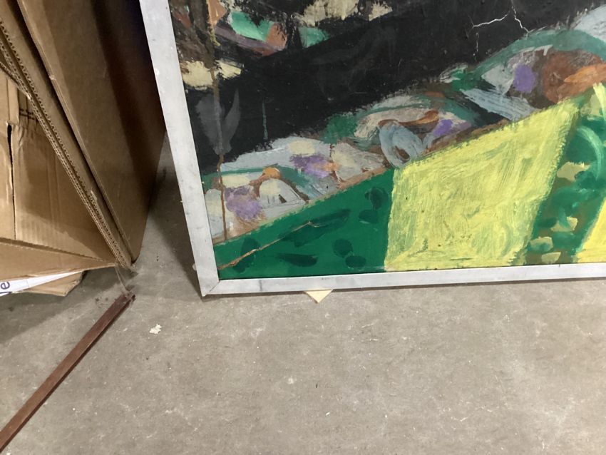 oil on board, signed framed overall size 123cm x 240cm Rip to bottom left corner of board, evidence of water damage throughout Note: James Hardie was an artist, pilot, writer and educator. He studied at GSA, 1955-59, received The Keith Award 1958, The Chalmers Bursary 1959, The Torrance Award in 1968 among others. Hardie returned as a painting lecturer 1980-1995. His first major art project, inspired by the rock formations at Fife Ness was the subject of a film; The Painters Landscape” commissioned by The Royal College of Art in 1967. Prime time 6pm BBC news broadcast his inaugural flight on an old Messerschmidt plane that he rebuilt by hand over many years, with help from British and French engineers. Hardie’s art explores the direct physical encounter of nature by exploring ways of traveling though it - the airplane, motorbike, boat. For Hardie, the wide open spaces in the Scottish landscape where sea meets land were a constant source of inspiration. He felt Scotland gave him everything and more than he needed. He was a fierce advocate of truth and speaking directly from first hand experience. When teaching at Aberdeen College of Education, he invented, together with his boss and fellow pilot Bill Burns, the concept of “Area Investigation“. Hardie would fly his students to remote islands all over Scotland and encourage them to engage with the people, landscape and culture in order to broaden their experience of life and art practice in new and surprising ways. Public collections include Aberdeen Art Gallery, University of Stirling, Scottish Arts Council, Contemporary Art Society, Kendal Art Gallery, Hospitalfield, South Lanarkshire Council, Low Parks Museum.