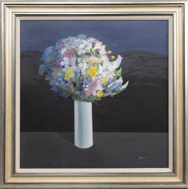 oil on board, signed framed and under glass image size 59cm x 59cm, overall size 76cm x 76cm Note: Danny Ferguson was educated at Airdrie Academy from 1936-1942. He was an athletic youngster, playing football for (amongst others) Baillieston Juniors, Bedlay Juniors, Douglas Water Thistle and Blantyre Victoria (taking over the centre-half position from Jock Stein). Later in life, he was a keen snooker player, frequently championing the Glasgow Art Club, and enjoyed Curling. He began studying at GSA in 1941 but his studies were interrupted when he was called up. He joined the Royal Air Force in 1943 and served in the Far East. He re-joined GSA in 1947 and was awarded his diploma in Drawing and Painting in 1949. That same year he won a £30 prize at the Royal Scottish Academy annual competitions. From 1949-1950 he attended the Jordanhill Teacher Training College. He later combined a position as visiting lecturer at GSA with teaching in various Glasgow Schools. He returned to GSA as a full-time lecturer in 1968. In 1958 Ferguson married Margaret Dunn, also a graduate of the Glasgow School of Art, in Embroidery and Weaving. They had two children, Anne and David. Probably best known for his landscapes, still lifes and self-portraits. He exhibited regularly, had numerous one-man shows, and his work still hangs in many collections, including the Royal Collection. Danny Ferguson was elected a member of the RSW in 1969, having exhibited there from 1961. He had over 88 works exhibited at the Royal Glasgow Institute, from 1957. He was a member of the Royal Scottish Society of Painters in Watercolour. Ferguson also served as honorary secretary of the RGI for nine years and was also elected President of the Glasgow Art Club.