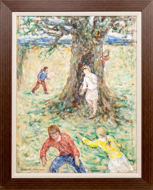 oil on board, signed and dated 1979, titled verso framed overall size 72cm x 54cm, overall size 85cm x 68cm Handwritten artist's label verso Note: Johnstone was born in Edinburgh in 1892 and grew up in Napier Road, near the Gothic Mansion, Rockville. Her father, landscape artist George Whitton Johnstone RSA (1849?1901), encouraged her artistic talents, and at the age of 16 she enrolled as a student at the Edinburgh College of Art. She took the Life Class with Ernest Stephen Lumsden where she revealed her talents at informal portraiture, a genre for which she became well known. In 1914 she became a member of staff at the Edinburgh College of Art. From the summer of 1915, she became a regular annual visitor to Kirkcudbright in Galloway, where she would paint with other mainly female artists including Jessie Marion King as part of the Kirkcudbright School. Dorothy Johnstone, with her close friends Cecile Walton and Mary Newbery, was a member of The Edinburgh School, which reformed in 1919, a collective of gifted and progressive artists associated with the Edinburgh College of Art. During 1919 she was living in Kirkcudbright where she had an affair with Vera Holme who would go on to be the 'Pankhursts' chauffeur'. In 1924, at the peak of her artistic career, Johnstone mounted a joint exhibition in Edinburgh with fellow artist Cecile Walton. She married her colleague and fellow group member David MacBeth Sutherland in 1924. They had a son, Sir Iain Sutherland, in 1925, and a daughter in 1928. As a consequence of her husband's appointment in 1933 as Head of Gray's School of Art in Aberdeen (now at Robert Gordon's University) and of the "marriage bar" in place at the time, she gave up her career and her students. She kept her links with Edinburgh by continuing to exhibit her portraits and landscapes at the Royal Scottish Academy to which she was elected an Associate (ARSA) in 1962. Johnstone painted landscapes and portraits, particularly of children, and her style was free and relaxed, whether using oil, watercolour, pencil or chalk. Some of her work is displayed at the National Gallery of Scotland. When she died in 1980, she bequeathed her important early painting 'Marguerites' (painted in 1912) to the Royal Scottish Academy. In 1983 Aberdeen Art Gallery gave her a major memorial show which toured, then in 1987 Bourne Fine Art (now The Fine Art Society) in Edinburgh and London staged a joint exhibition of the works of Dorothy Johnstone and her husband David MacBeth Sutherland.