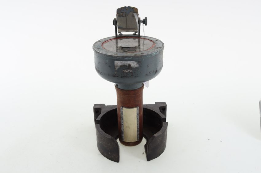 with a cream circular floating dial, contained in a brass case, along with a Sestrel handheld compass with a circular floating dial, metal case and wooden handle with rubber wall mounted fixing, with retailer mark for Henry Browne & Son Ltd the first - 16cm diameter
