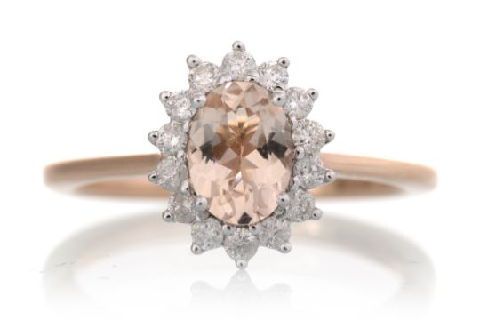 set with a central morganite within a halo of diamonds, in nine carat rose gold, size M 1/2 2.3g