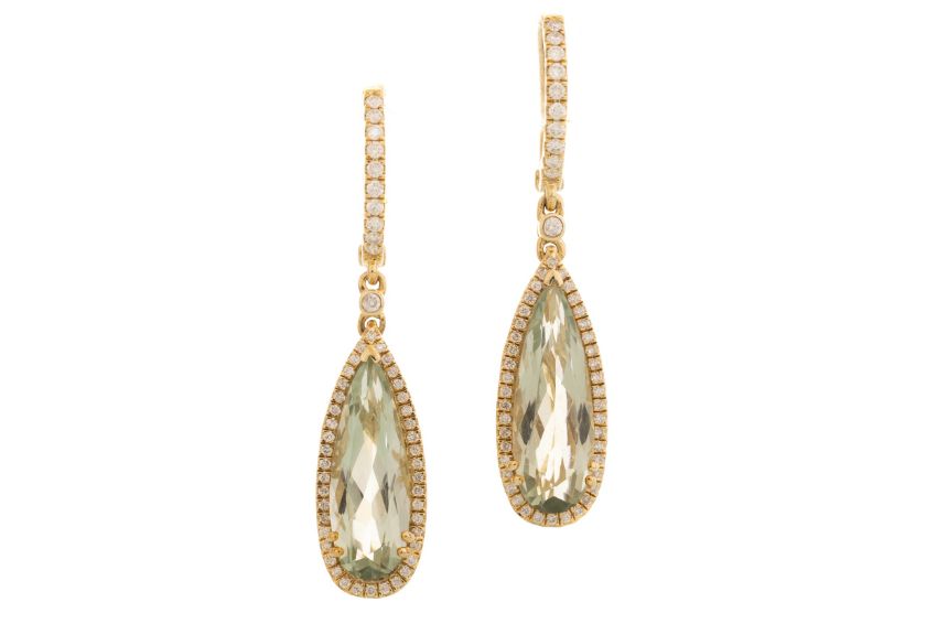 set with teardrop prasiolite stones within a halo of diamonds, the hoops also set with diamonds totalling approximately 0.45 carats overall, in nine carat gold
